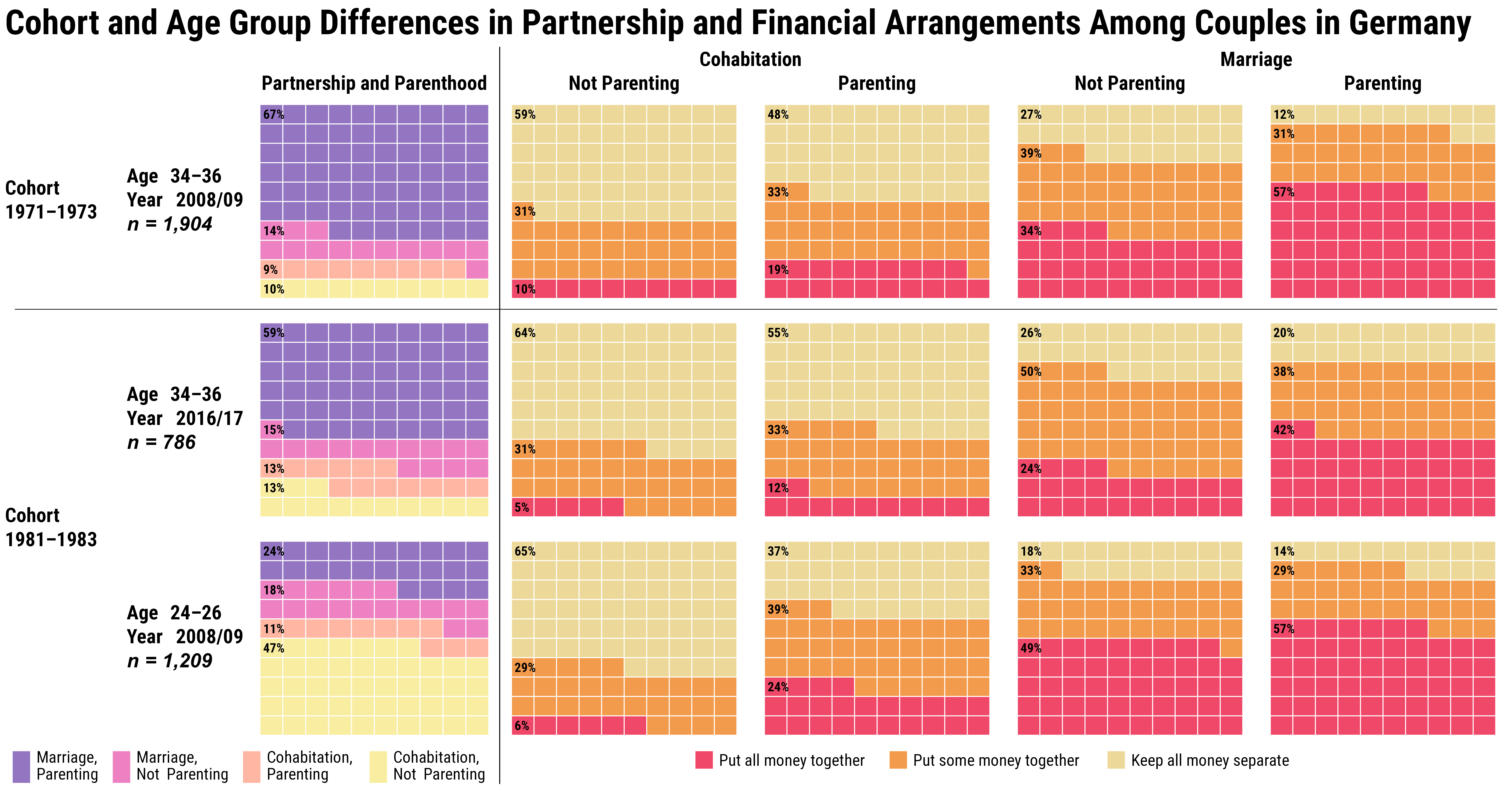 The visualization and this supplement build on previous work of Pepin (2022) and are, therefore, similarly structured. While Pepin has focused on US data and differences in money arrangements by marital and parental status, by age group, and for different-gender and same-gender couples, we utilized the unique cohort-sequence design of the German Family Panel (“pairfam”) that allows for between and within cohort comparisons.